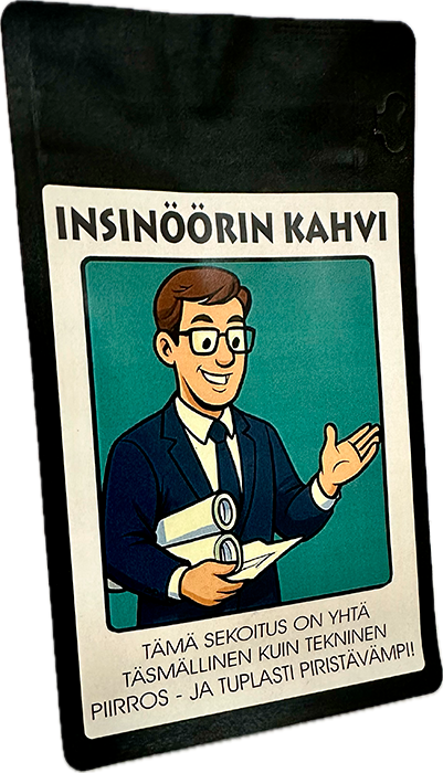 Insinöörin kahvi, 200 g ”TÄMÄ SEKOITUS ON YHTÄ TÄSMÄLLINEN KUIN TEKNINEN PIIRROS – JA TUPLASTI PIRISTÄVÄMPI!” Käyttövalmis vadelma-aromilla maustettu kahvi, 200 g. Käytetään normaalin suodatinjauhatuksen tavoin. Hinta: 12.90 €